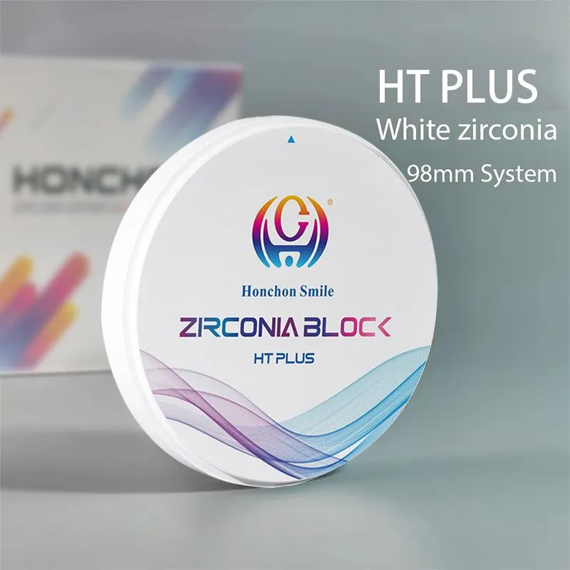 HONCHON 98×14 HT hvítur sirkondiskur er hannaður til að framleiða stöðugar og áreiðanlegar tannendurgerðir eins og krónur og brýr. Með beygjustyrk upp á um1350 MPaog hálfgagnsæi um40%, það er hentugur fyrir aftari endurbætur og langar-brýr.